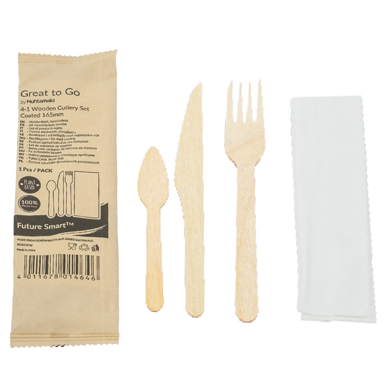Home / Accessories / Cutlery / Future Smart™ wooden cutlery set with napkin – coated View Image Future Smart™ wooden cutlery set with napkin – coatedItem Number: 50000979Cutlery x250Pieces Per Case x70Cases Per Pallet Quantity of Cases Future Smart™ wooden cutlery set with napkin - coated quantity Full Palletsx0,01Full Pallets Progress You are 69 Case(s) away from 1 Full Pallet(s)Packaging Breakdown Piecesx250 Packagesx1 Palletsx0,01 Certain features are only available to users with special access rights. You can apply to open an account with us. Log In Request Access Product Information Safe for food contact Future Smart Does not contain any plastic Specifications Material Wood Pcs / Package 250 Package / Case 1 Case / Pallet 70 Outer Case EAN 4011678117088 Related products Favourite View ProductFuture Smart™ wooden icecream spoon – coated, 95 mmItem Number: 50000905 Favourite View ProductFuture Smart™ paper tea spoon, 116 mmItem Number: 50000338 Favourite View ProductFuture Smart™ paper spoon, 165 mmItem Number: 50000670 Favourite View ProductFuture Smart™ wooden fork – coated, 160 mmItem Number: 50000558
